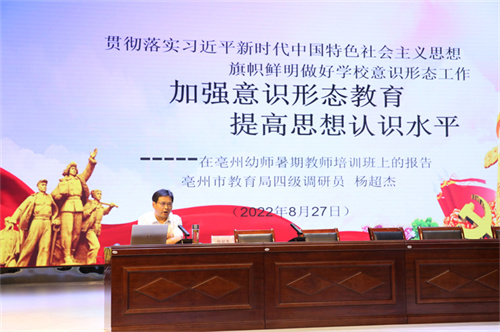 8月27日,亳州幼儿师范学校邀请亳州市教育局四级调研员杨超杰到校开展意识形态专题讲座,进一步强化对教师思想政治教育和引导。